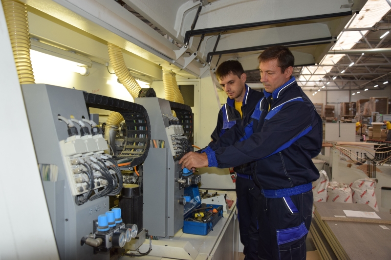 Виктор Токарев и Виталий Ибрагимов проверяют исправность кромко-облицовочного станка